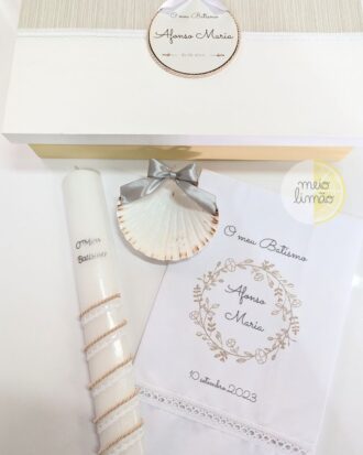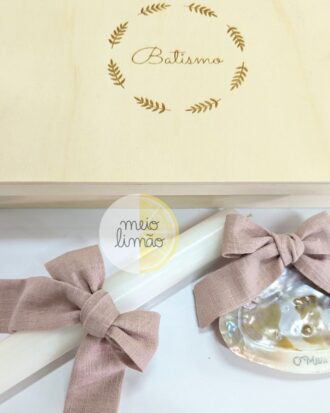 Conjunto de Batizado: Caixa com gravação a laser, com a possibilidade de colocar nome e data Toalha de linho e