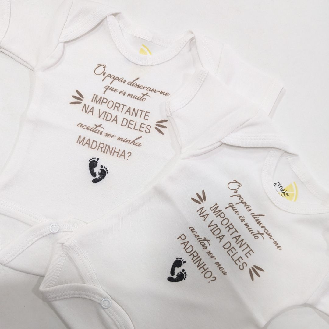 Body, 100% algodão, manga curta ou comprida, disponível nos tamanhos: 1 mês, 3 meses, 6 meses, 12 meses, 18 meses e 24 meses.