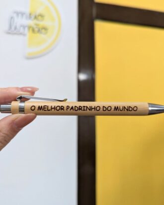 Esferográfica em bambu com clipe em metal. Escrita a azul. Por ser um produto composto por materiais naturais, a cor do produto e o resultado da impressão podem variar entre produtos.