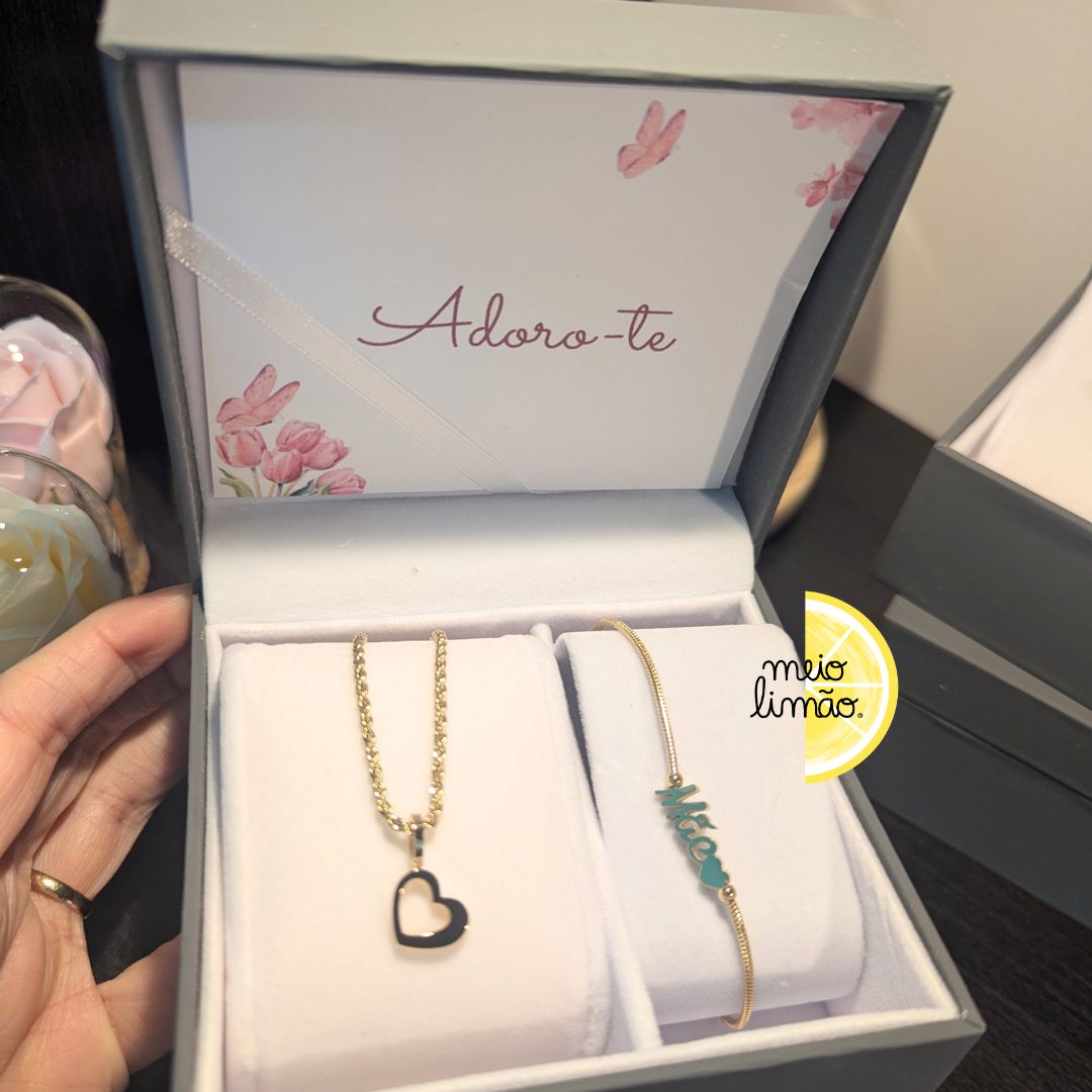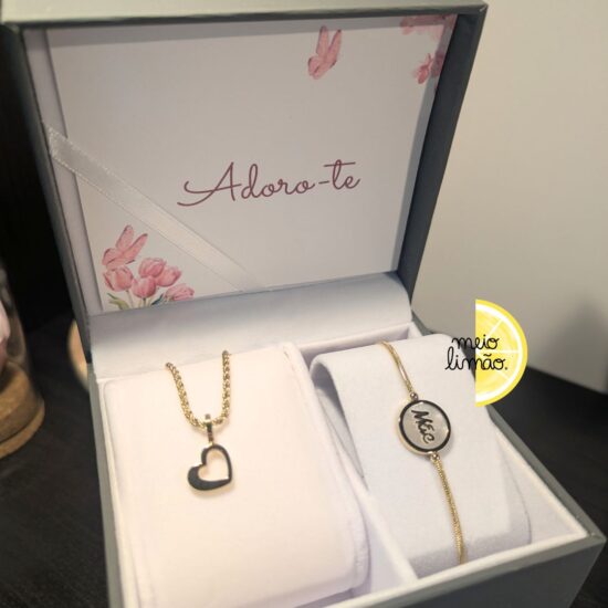 A pulseira apresenta a palavra “Mãe”, tornando-o um símbolo único de carinho e ligação especial. O colar complementa o conjunto com um “coração”, com um toque delicado e um significado especial.