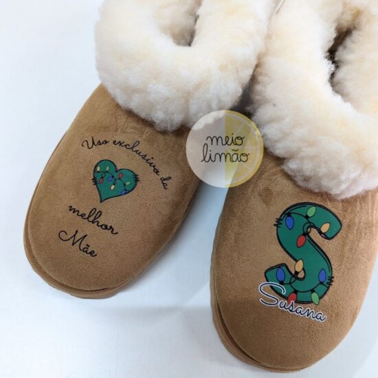 Perfeitas como presente de Natal ou para dar aquele mimo confortável em casa, estas pantufas/chinelos combinam estilos clássico e festivo: tom camel neutro e sofisticado, pêlo interior que aquece e aconchega, e personalização que torna cada par único.