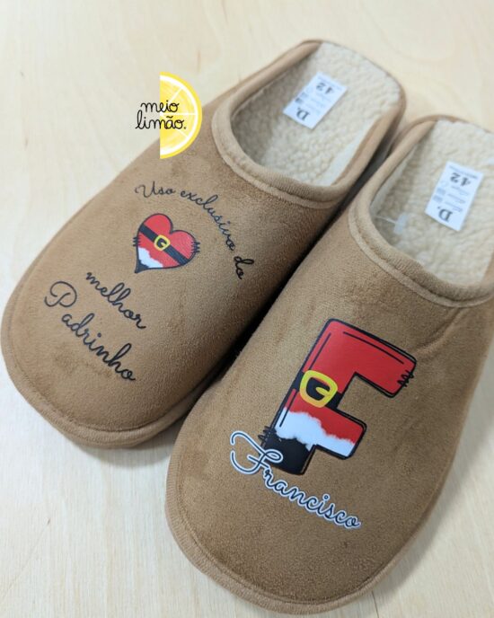 Perfeitas como presente de Natal ou para dar aquele mimo confortável em casa, estas pantufas/chinelos combinam estilos clássico e festivo: tom camel neutro e sofisticado, pêlo interior que aquece e aconchega, e personalização que torna cada par único.