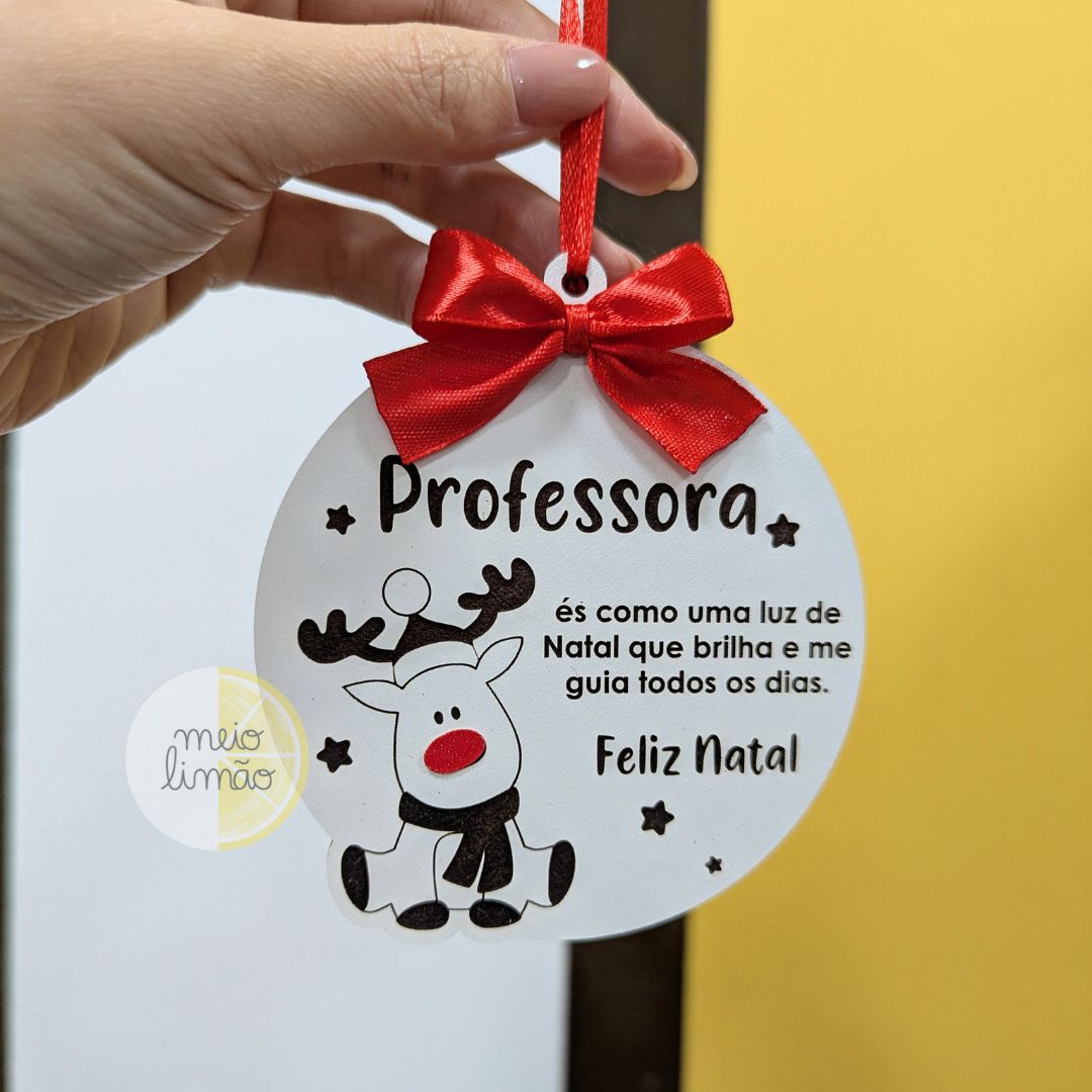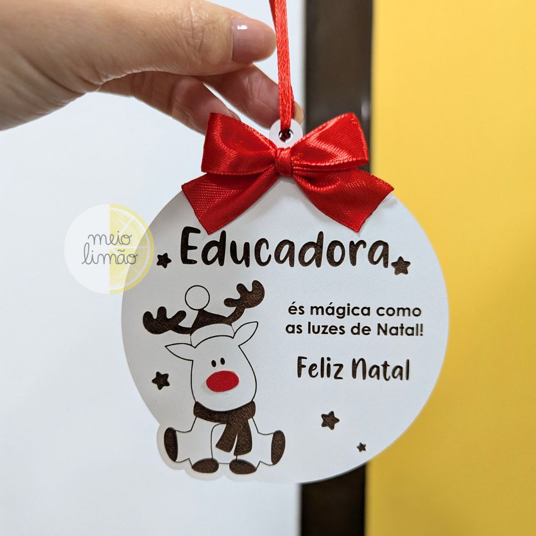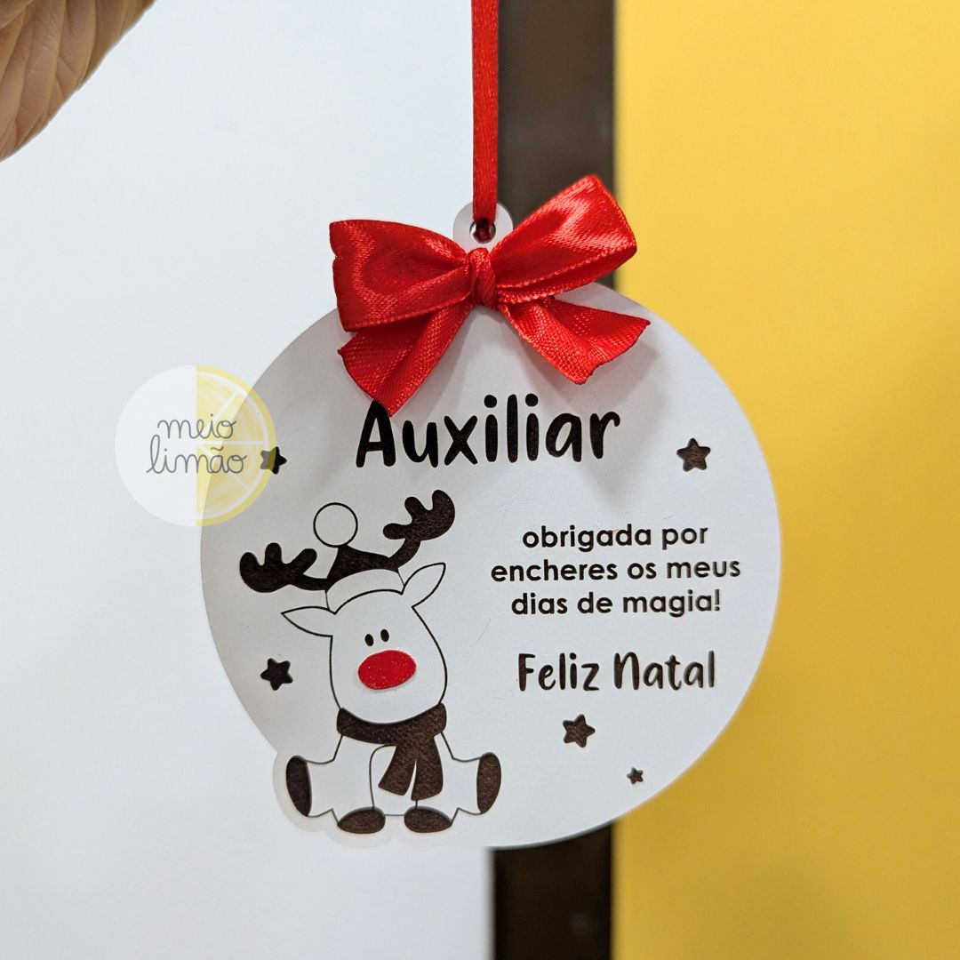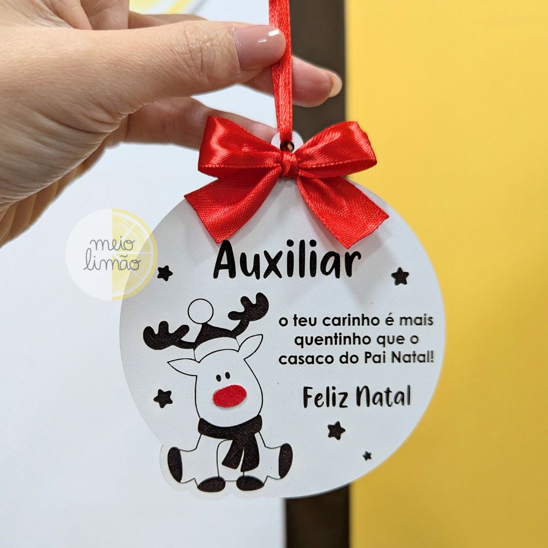 Transforma a lembrança de Natal num gesto de carinho e reconhecimento com este pendente em MDF lacado branco, gravado a laser com uma rena fofa de nariz vermelho. O texto é personalizável e ainda podes adicionar o nome da profissional ou da criança que oferece o presente — para tornar o pendente realmente especial e pessoal.