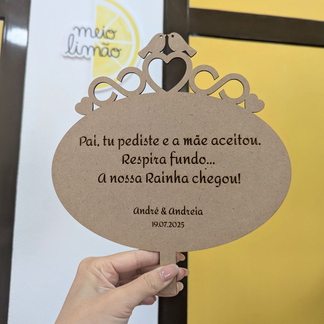 Torna o momento ainda mais especial com esta **placa personalizada em madeira ou MDF** com frase dedicada ao noivo. Idealmente usada por uma criança para anunciar a chegada da noiva, esta peça é feita de material leve e resistente, personalizada com a frase que escolheres, como “Aqui vem a melhor noiva do mundo” ou “A noiva está linda!”. Pode ainda incluir o nome dos noivos, a data ou um detalhe decorativo que combine com o estilo do casamento. Um bonito acessório decorativo que complementa o casamento, registo fotográfico e lembrança do dia.